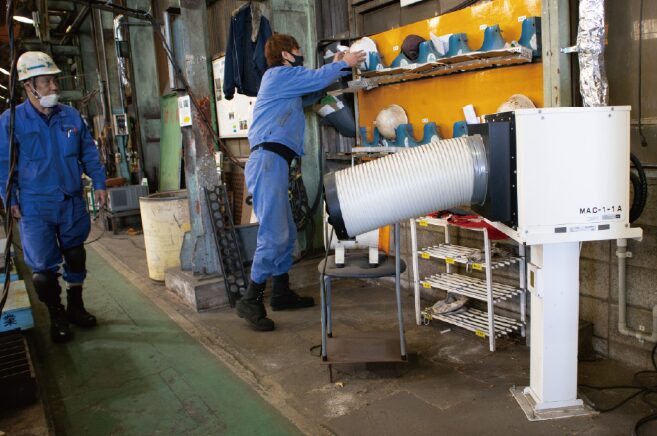 もちろん、社員の安全と雇用を守ることが使命と考える当社としては、できる限りの対策はしてきました。ひとつは送風機の設置です。しかし、地球温暖化の影響なのか、近年は異常なほどの高温となるため、熱い風をかき回しているような状況でした。スポットクーラーも検討しました。しかし、その場で排熱が出てしまうので、暑さの緩和は期待できません。さらに、作業着のなかにファンが取り付けられている空調服を導入したこともありましたが、さほど効果は得られませんでした。