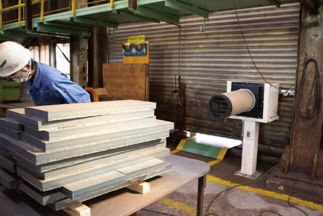 当社工場は前述の通り、レーザー切断機やNCプラズマ切断機、NCガス切断機を使用して厚中板を切断していますが、これらは熱源となるため、どうしても暑いところでの作業となります。また、大空間の建屋は老朽化しており、現代的な断熱対策もなされていません。加えて、大型の機械が多く工場内のスペースは限られているため、エアコンを導入することができず、夏場はかなり高温の環境になっていました。
